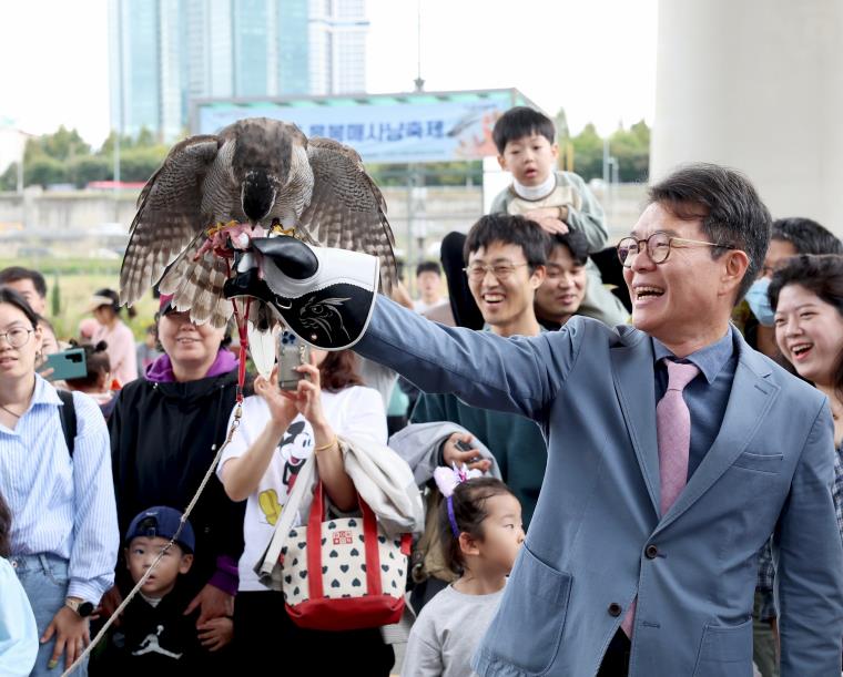 | ▲ 2024년 ‘응봉 매사냥 축제’에서 정원오 성동구청장이 매를 손에 올리고 있는 모습 |