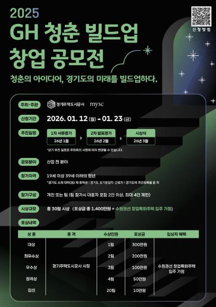 [메이저뉴스]경기주택도시공사(GH)는 ‘청춘의 아이디어, 경기도의 미래를 빌드업하다!’라는 슬로건 아래, 청년들의 참신한 창업 아이디어 발굴을 위한 '2025 GH 청춘 빌드업 창업 공모전'을 24일 공고했다고 밝혔다.