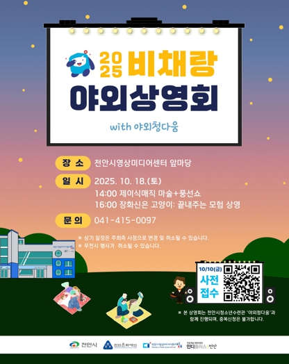 [메이저뉴스]천안문화재단은 오는 18일 천안시영상미디어센터에서 ‘2025 비채랑 야외상영회’를 운영한다고 13일 밝혔다.