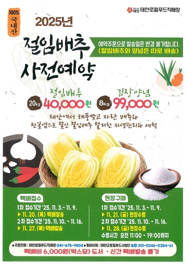 11월 9일 1차 접수가 마감돼 20일 일괄 택배 발송되며, 2차 접수는 11월 16일 마감돼 27일 발송된다. 직접 수령하고자 하는 구매자는 사전 예약 후 21일(1차 접수자)과 28일(2차 접수자) 태안로컬푸드직매장(남면 안면대로 1641)을 방문하면 된다. 수령시간은 오전 11시부터 오후 7시까지다.
