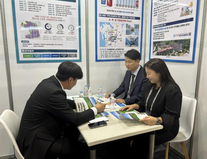 | ▲ ADEX 2025에서 군관계자가 청양군 투자홍보 부스에서 상담을 진행하고 있다. |