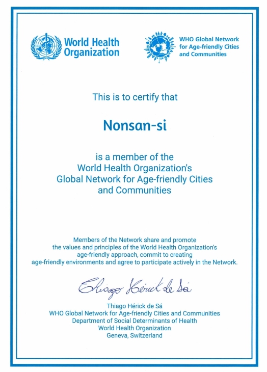 논산시는 2018년 전국 8번째이자 충청남도 최초로 WHO 고령친화도시 국제 네트워크에 가입했다. 이후 2020년 2기 재인증을 거쳐 올해 9월 세 번째 인증을 받았다.