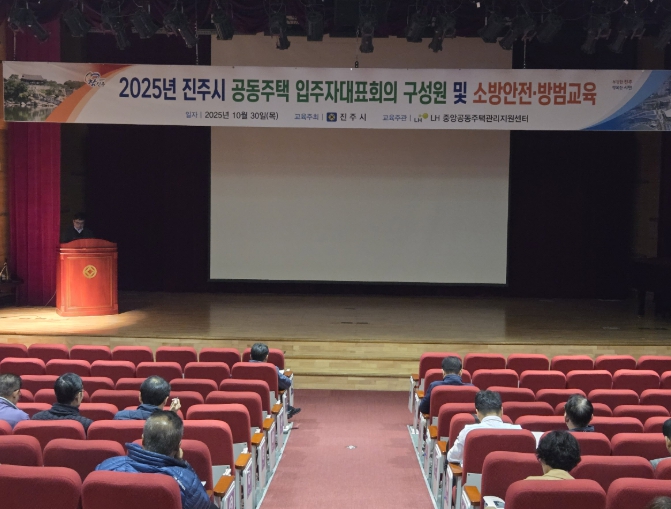 [메이저뉴스]진주시는 지난 30일 무지개동산의 ‘평생학습관’ 다목적강당에서 의무관리 대상 공동주택 입주자대표회의 구성원과 시설물 안전관리 책임자 및 경비 책임자를 대상으로 ‘2025년 공동주택 입주자대표회의 구성원 교육 및 소방안전·방범 교육’을 실시했다.