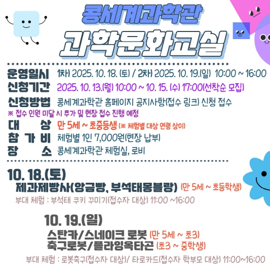 최수영 기술지원과장은 “과학문화교실을 통해 아이들이 과학에 흥미를 느끼고, 자신의 적성에 맞는 진로를 탐색하는 계기가 되길 바란다”며 “많은 어린이와 청소년의 참여를 기대한다”고 말했다.