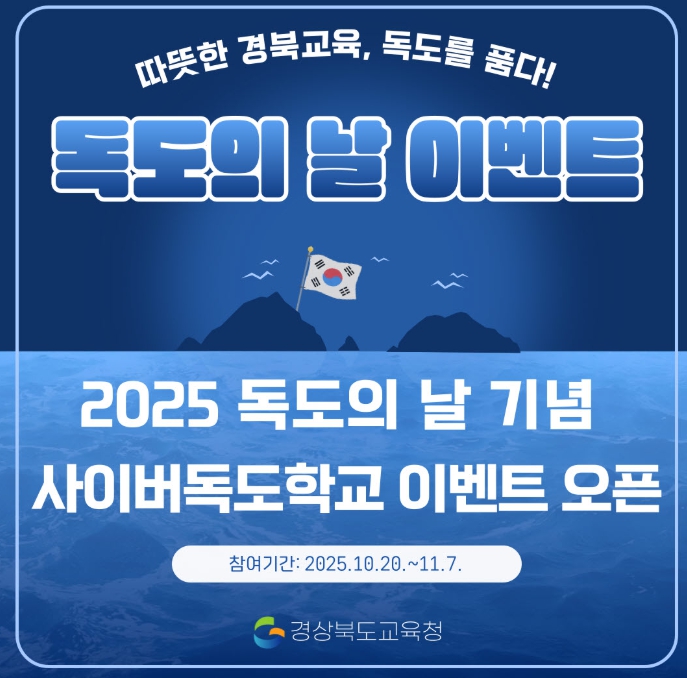 [메이저뉴스]경북교육청은 독도의 날(10월 25일)을 맞아 20일부터 다음 달 7일까지 3주간, 전 국민이 참여할 수 있는 ‘2025 독도의 날 기념 독도사랑 온라인 축제’를 운영한다고 밝혔다.