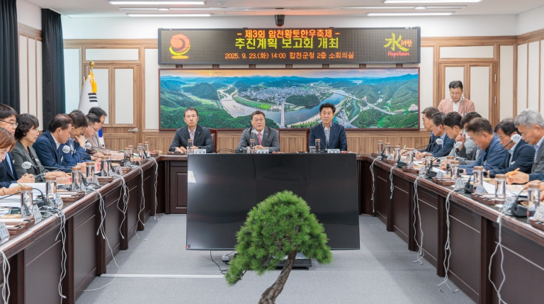 [메이저뉴스]합천군은 9월 23일 군청 2층 소회의실에서 제3회 합천황토한우축제 추진계획 보고회를 열었다. 이번 보고회는 합천축산업협동조합(조합장 김용욱)이 주최·주관하고 합천군과 합천군의회가 후원하는 행사로, 축제의 성공적 개최를 위해 진행 상황을 점검하고 부서 간 협력 체계를 공고히 하기 위해 마련됐다.