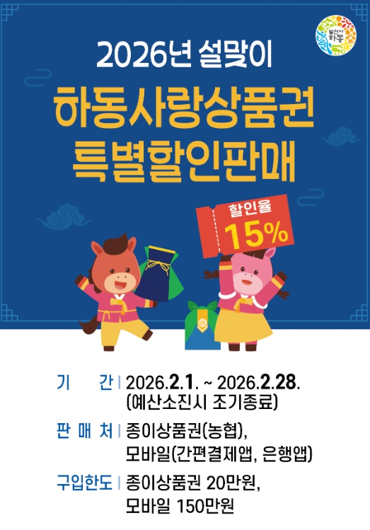[메이저뉴스]하동군은 설 명절을 맞아 지역 내 소비를 촉진하고 소상공인의 매출 증대를 도모하기 위해 '2026년 설맞이 하동사랑상품권 특별할인판매'를 실시한다고 밝혔다.