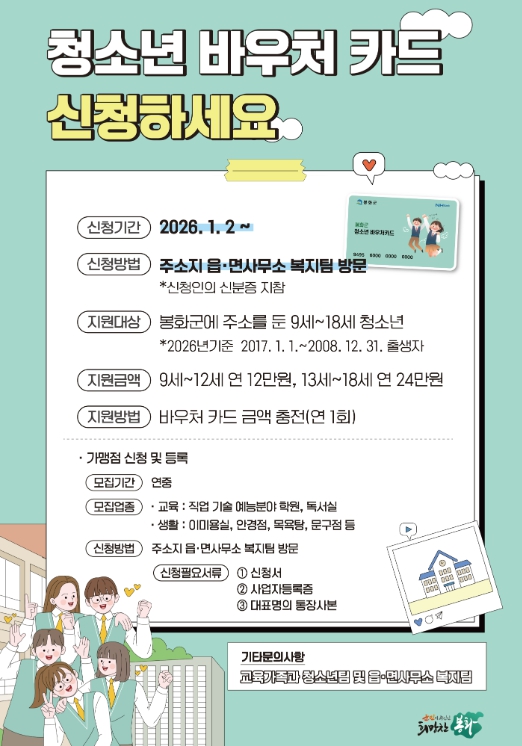 [메이저뉴스]봉화군은 지역 청소년의 건강한 성장 발달과 복지 증진을 위해 2026년 1월 2일부터 봉화군 청소년 바우처 카드 신청을 받는다.