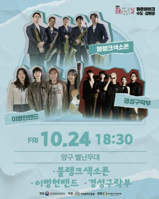 공연은 24일 오후 6시 30분 국토정중앙면 별난무대와 25일 낮 12시 30분 양구읍 박수근광장에서 각각 진행된다. 양구의 대표 문화공간을 무대로 펼쳐지는 이번 공연에는 다양한 장르의 청춘 아티스트들이 참여해 풍성한 무대를 선사할 예정이다.