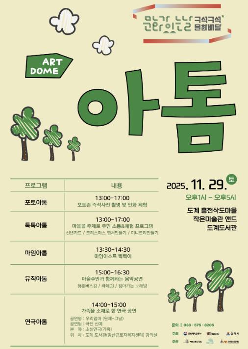 오는 11월 문화가 있는 날 주간에 맞춰 도계읍에 새롭게 조성된 ‘오픈 스페이스 파빌리온 돔(DOME)’을 중심으로 도계 흥전삭도마을, 도계 작은미술관 앤드, 도계도서관 등에서 체험·공연·연극을 즐길 수 있도록 구성됐다.