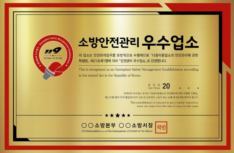 ‘다중이용업소 안전관리 우수업소’ 선정 제도는 영업주의 자율적인 안전관리를 통해 소방안전 문화를 정착시키고, 안전관리에 대한 자긍심을 고취하기 위해 운영되는 제도이다.