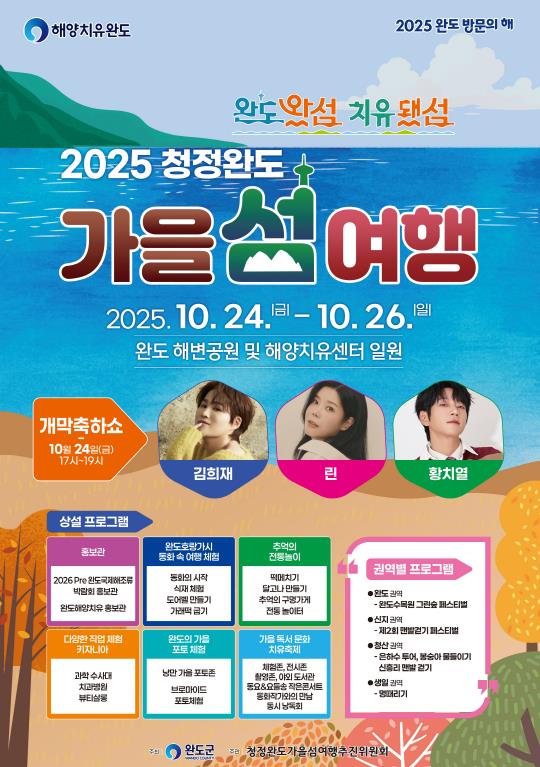 [메이저뉴스]완도군은 10월 24일부터 26일까지 3일간 완도 해변공원과 해양치유센터 일원에서 '2025 청정 완도 가을 섬 여행' 행사를 개최한다.