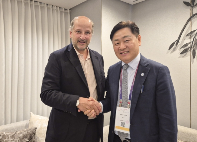 | ▲ 20일 시그니엘 서울호텔에서 열린 '세계올림픽도시연맹 총회' 의 연계행사인 ‘스마트시티&스포츠 서밋’에 참석한 김관영 도지사가 그레고리 주노드 세계올림픽도시연맹회장(스위스 로잔 시장)과 면담을 갖고 있다 |