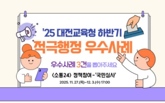 [메이저뉴스]대전시교육청은 11월 27일부터 12월 3일까지 2025년 하반기 적극행정 우수사례를 선발하기 위한 온라인 국민심사를 실시한다고 밝혔다.