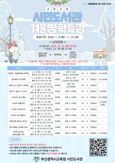 [메이저뉴스]부산광역시립시민도서관(관장 이은경)은 내년 1월 6일부터 31일까지 시민도서관에서 부산 지역 유아 및 초등학생 195명을 대상으로 ‘겨울방학특강’을 운영한다.