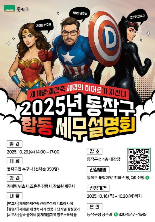[메이저뉴스]동작구가 오는 10월 29일 오후 2시, 구청 신청사 4층 대강당에서 재개발 및 재건축 분야를 주제로 ‘2025년 합동 세무 설명회’를 개최한다고 밝혔다.