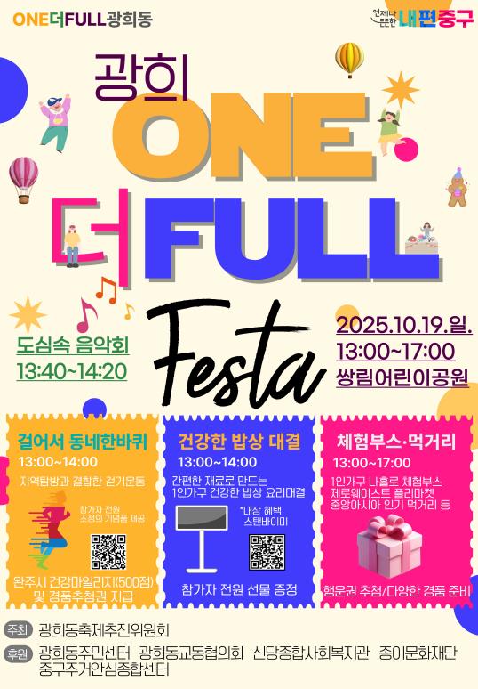 [메이저뉴스]서울 중구는 오는 10월 19일 오후 1시부터 5시까지 쌍림어린이공원에서 『2025 광희 ONE더FULL 페스타』를 개최한다고 밝혔다.