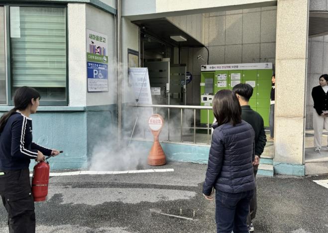 15시경 화재 발생을 가정해 △화재경보 발령, △대피 유도, △초기 진화 순으로 진행됐으며, 소화기 사용법 등 실습 중심의 교육도 병행했다.