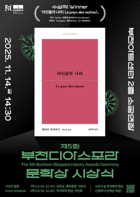 [메이저뉴스]부천시는 11월 14일 부천아트센터에서 열리는 ‘2025년 제5회 부천디아스포라문학상’ 시상식을 앞두고, 수상작으로 레일라 슬리마니 작가의 ‘타인들의 나라(Le pays des autres)’를 선정했다고 22일 밝혔다.