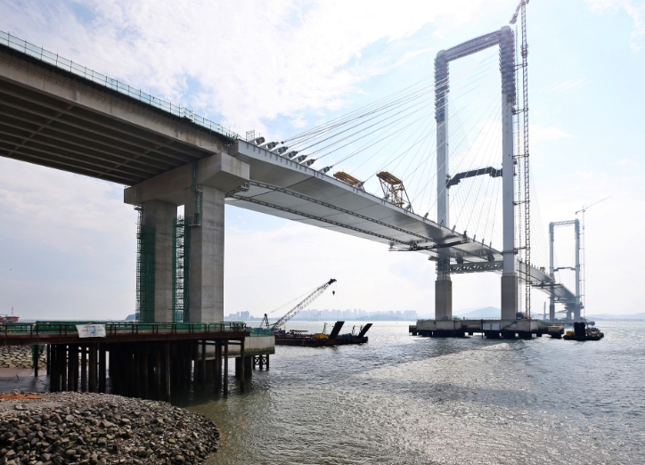| ▲ 제3연륙교 시공 현장(제3연륙교는 세계 최고 높이인 184.2m 주탑 전망대와 수변데크길, 자전거도로, 야간경관 등을 갖춘 체험·관광형 교량으로 세워진다. 9월 12일 마지막 상판 설치 작업이 완료됐으며, 현재 공정률은 약 94% 이다.) |