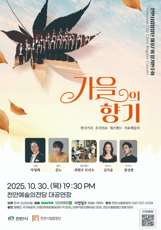[메이저뉴스]천안시립합창단이 오는 30일 오후 7시 30분 천안예술의전당 대공연장에서 제97회 정기연주회 ‘가을의 향기’를 개최한다.