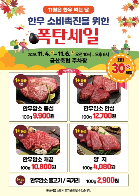 [메이저뉴스]한우 농가의 경영 안정을 위한 폭탄세일 행사가 11월 4일부터 11월 6일까지 금산축협 주차장에서 열린다.