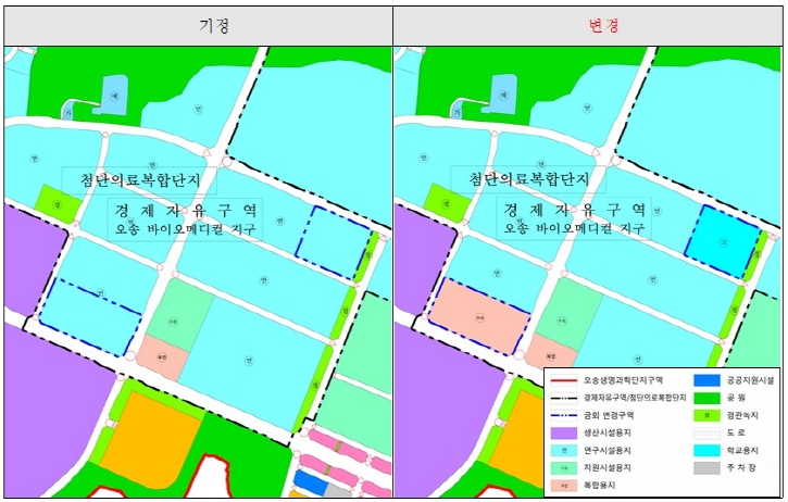 [메이저뉴스]충북도는 11월 17일 오송첨단의료복합단지의 토지이용계획을 변경하는 개발실시계획이 승인됐다고 밝혔다. 이를 통해 오송읍 연제리 682-2, 682-3은 연구시설용지에서 복합용지로, 연제리 657은 연구시설용지에서 학교시설용지로 변경된다.