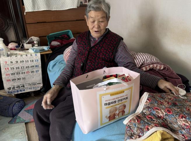 혹한기에 필요한 보온·건강용품으로 구성된 마음따뜻 건강키트(15만원 상당)는 청심환, 가스활명수, 보온주전자 등 어르신들의 사용도가 높은 품목들로 꾸려졌다.
