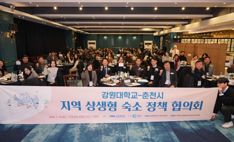강원대 KNU 글로벌인재네트워크센터 주관으로 지난 14일 미래웨딩컨벤션에서 ‘강원대학교-춘천시 지역 상생형 숙소 정책협의회’가 열렸다. 이 자리에서는 춘천시는 그간 강원대와 추진해 온 외국인 유학생 취업연계형 인턴십 사업의 운영 성과와 향후 확대 방향이 소개됐다. 행사에는 인턴십에 참여한 외국인 유학생과 기업 관계자를 비롯해 춘천시, 강원대 관계자 등 100여 명이 참석했다.