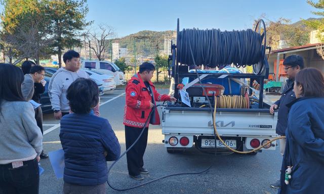 | ▲ 강진읍사무소 주차장에서 직원들을 대상으로 진화장비 작동법을 교육하고 있다. |
