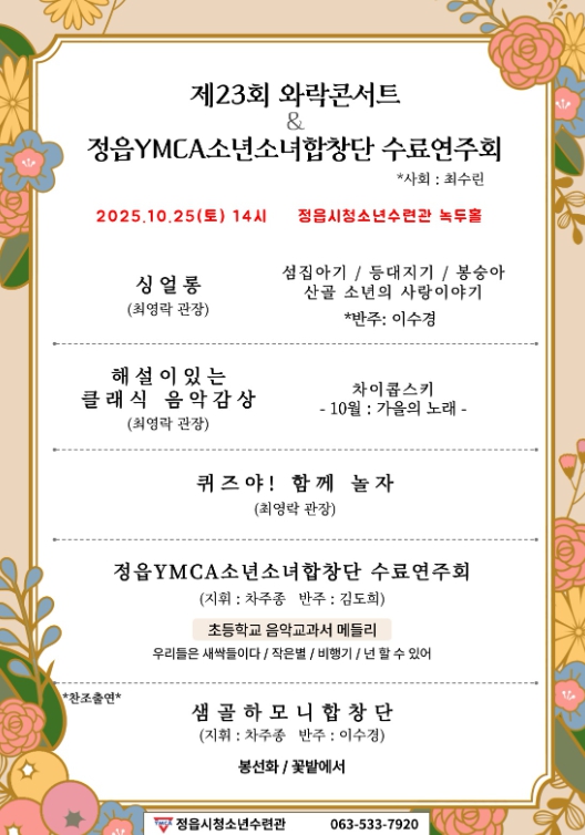 공연은 관객과 함께 노래하는 싱어롱을 시작으로 ▲해설이 있는 클래식 음악 감상(차이콥스키 ‘10월: 가을의 노래’) ▲퀴즈 한마당 ▲정읍YMCA소년소녀합창단 수료 연주회 등 다채로운 프로그램으로 구성됐다.