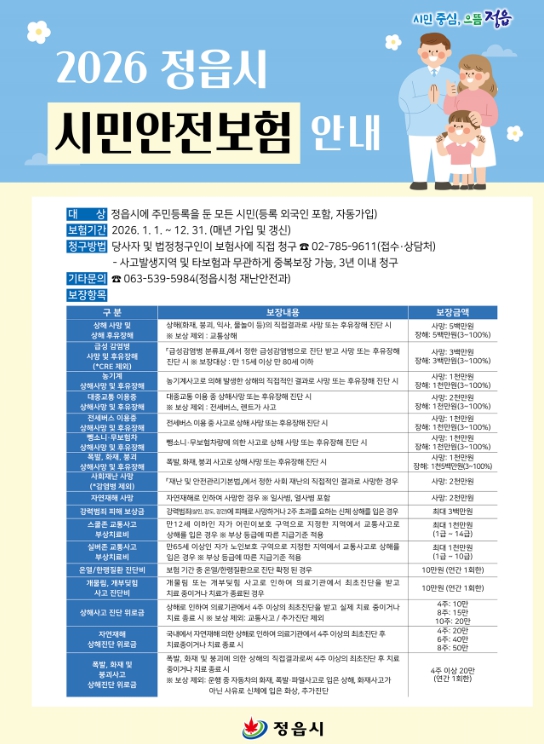 [메이저뉴스]정읍시가 각종 재난과 일상 속 사고로부터 시민들을 보호하기 위해 2026년 시민안전보험의 보장 범위를 대폭 강화했다.