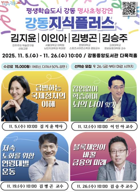 이수희 강동구청장은 “급변하는 사회 속에서 새로운 지적 통찰과 지속 가능한 삶의 지혜를 나누는 장으로 마련했다”라며 “서울 자치구 최대이자 인문예술 특화 도서관인 강동중앙도서관에서 열리는 특강인 만큼, 구민들이 미래 사회를 준비할 수 있는 귀중한 지적 자산을 얻게 되길 기대한다”라고 말했다.