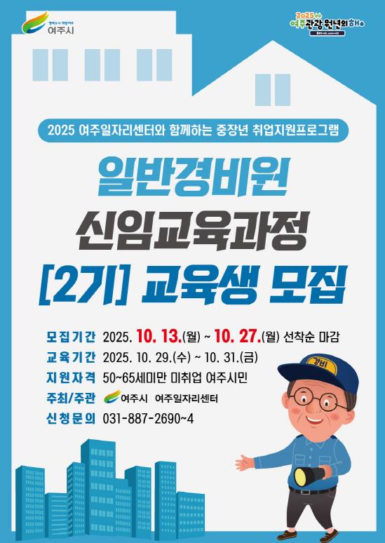 [메이저뉴스]여주시는 10월 13일부터 10월 27일까지 베이비부머(중장년) 취업지원을 위한 ‘2025년 일반경비원 신임교육과정 2기 교육생’을 모집한다.