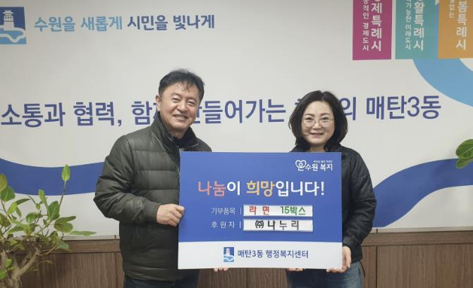 | ▲ 수원시 영통구 매탄3동, ㈜나누리로부터 설 맞이 '사랑의 라면 15박스' 기탁받아 |