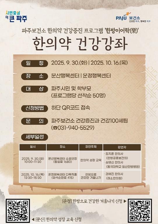이번 강좌는 파주시민 각 50명을 대상으로 포스터 내 정보 무늬(QR코드)를 통해 신청 가능하며, 강좌를 통해 생활 속에서 실천할 수 있는 한의약적 건강관리 방법을 배우는 기회가 될 것으로 기대된다.