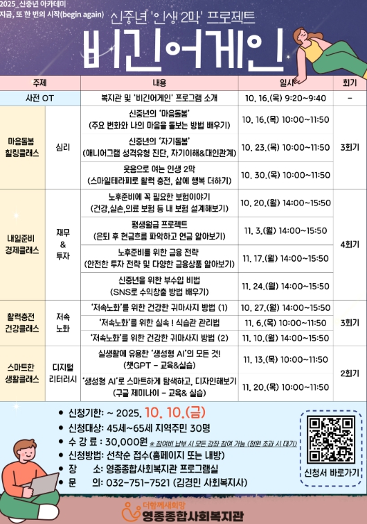 [메이저뉴스] 인천 중구 영종종합사회복지관은 오는 10월 16일부터 11월 24일까지 45세~65세 지역 주민을 대상으로 신중년 아카데미 ‘비긴어게인’을 운영한다고 밝혔다.
