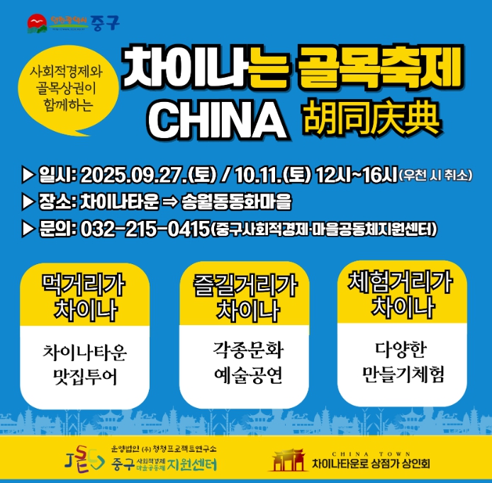 [메이저뉴스]인천 중구 사회적경제·마을공동체 지원센터는 올해 9월부터 11월까지 인천 차이나타운·동화마을 일원에서 ‘2025년도 사회적경제와 골목상권이 함께하는 '차이나는 골목축제'’를 개최한다고 25일 밝혔다.