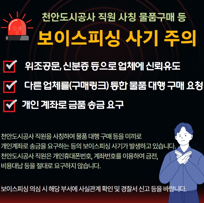 [메이저뉴스]천안도시공사가 최근 공사 직원을 사칭한 보이스피싱 사례가 발생함에 따라 피해 예방을 위한 주의를 당부했다.