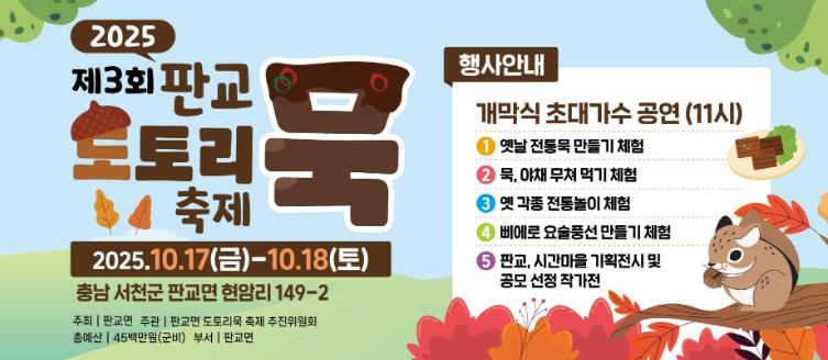 축제는 판교면 도토리묵 축제 추진위원회가 주관하며, 주민 화합과 지역 특산품 ‘판교 도토리묵’ 홍보에 초점을 맞췄다.