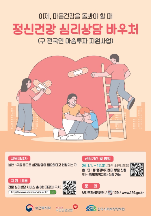 ‘정신건강 심리상담 바우처사업’은 우울·불안 등 정서적 어려움을 겪는 시민들이 대화 기반 전문 심리상담 서비스를 이용할 수 있도록 이용권(바우처)을 지원한다.
