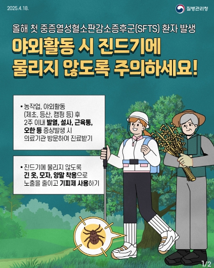 야외 활동·농작업 시 지켜야 할 예방 수칙은 △긴팔, 긴바지, 양말, 모자, 장갑 착용 △3~4시간마다 진드기 기피제 사용 △귀가 후 세탁과 샤워하기 △의심 증상 확인 시 즉시 의료기관 진료 등이다.