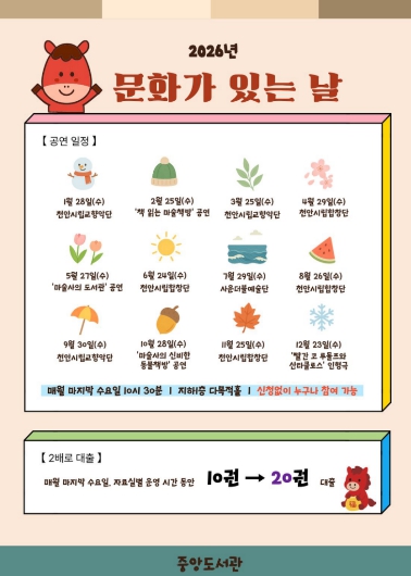 [메이저뉴스] 천안시 중앙도서관은 매달 마지막주 수요일 ‘2026 문화가 있는 날’을 운영한다고 19일 밝혔다.