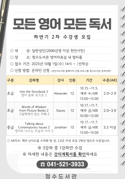 [메이저뉴스]천안시 청수도서관은 내일 1일부터 성인 영어 프로그램 ‘모든 영어 모든 독서’ 수강생을 모집한다고 30일 밝혔다.