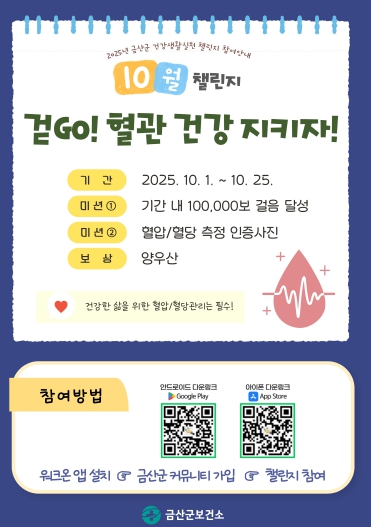 [메이저뉴스]금산군보건소는 사진인증으로 함께하는 2025 건강생활실천 ‘걷고(GO)! 혈관 건강 지키자!’ 챌린지를 오는 25일까지 진행한다.