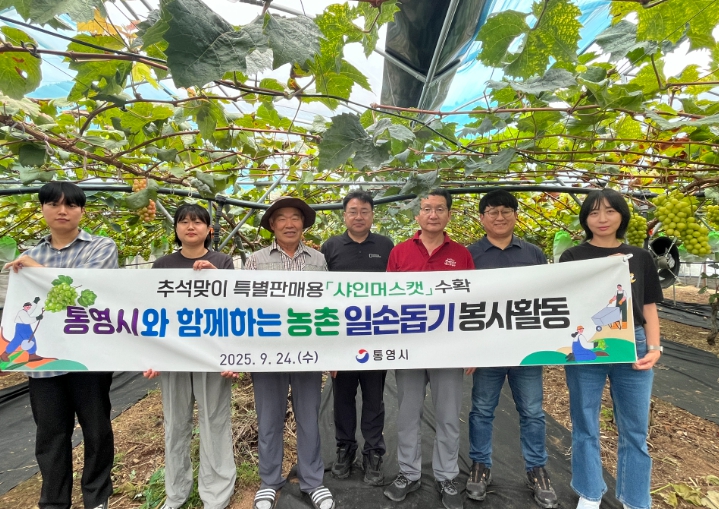 [메이저뉴스]통영시는 추석 명절을 앞두고 농촌 인력 부족으로 어려움을 겪는취약계층 어르신 농가를 지원하기 위해 지난 24일 도산면 한퇴마을 소재 해풍마루 농원에서 샤인머스캣 수확 농촌일손돕기 봉사활동을 실시했다.