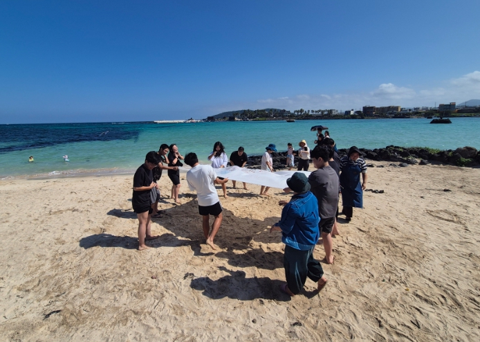 학생들은 감·쪽 등 제주 고유의 천연염료를 이용해 몸을 활용한 회화 활동을 펼치며 자연의 색을 표현했고, 제주의 바다·햇빛·바람을 느끼며 쪽염색으로 ‘나만의 바다’를 스카프에 담아냈다.