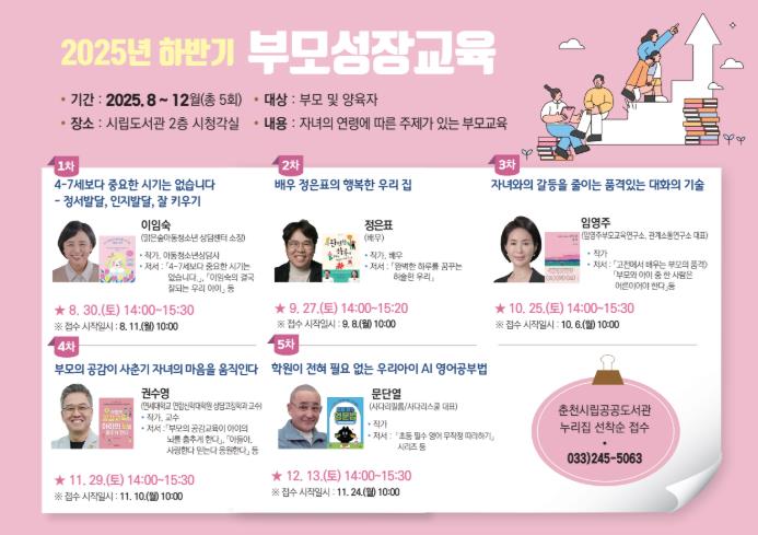 10~12월 부모성장교육 신청은 춘천시립공공도서관 누리집에서 받고 있으며 자세한 문의는 춘천시립도서관 독서문화팀으로 하면 된다.