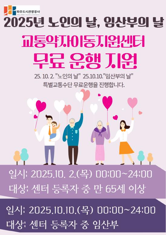 [메이저뉴스]파주도시관광공사 교통약자이동지원센터는 10월 2일 “노인의 날”과 10월 10일 “임산부의 날”을 맞이하여 특별교통수단 무료 운행 서비스를 진행한다고 밝혔다.