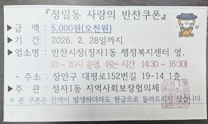 | ▲ 수원시 장안구 정자1동 지역사회보장협의체, 매월 취약계층에 '정일동 사랑의 반찬쿠폰' 지급 |